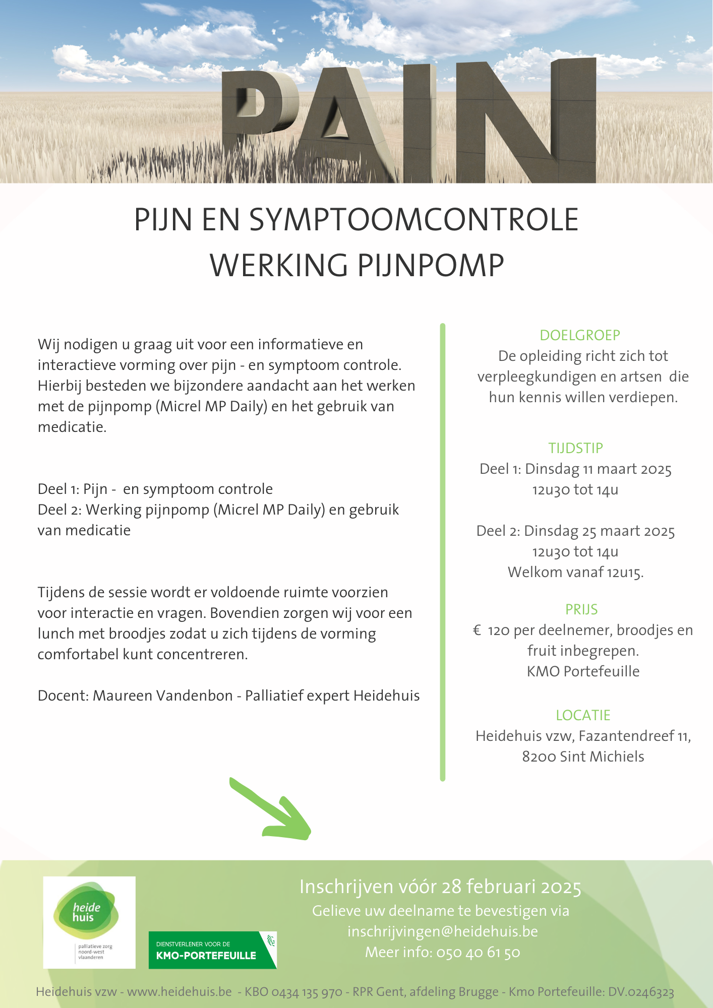 Deel 2: Werking pijnpomp (Micrel MP Daily) en gebruik van medicatie Tijdens de sessie wordt er voldoende ruimte voorzien voor interactie en vragen. Bovendien zorgen wij voor een lunch met broodjes zodat u zich tijdens de vorming comfortabel kunt concentreren.